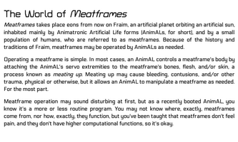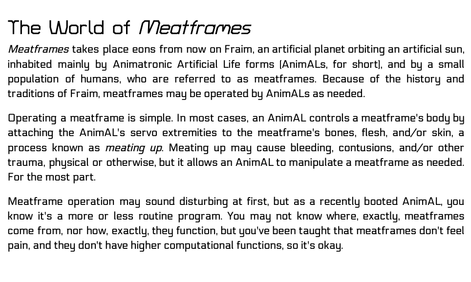 I've posted a "playtest trashcan" edition of the game I've been working on, Meatframes. Meatframes, is a roleplaying game about young robots training to operate human bodies for use in responding to an impending threat. You play as the robots. The humans are known as meatframes because you wear and/or otherwise manipulate their bodies when you fight or run important operations. Meatframes is a game about operating a human body you do not actually occupy, so there's likely a bit of body horror involved. Be warned.
